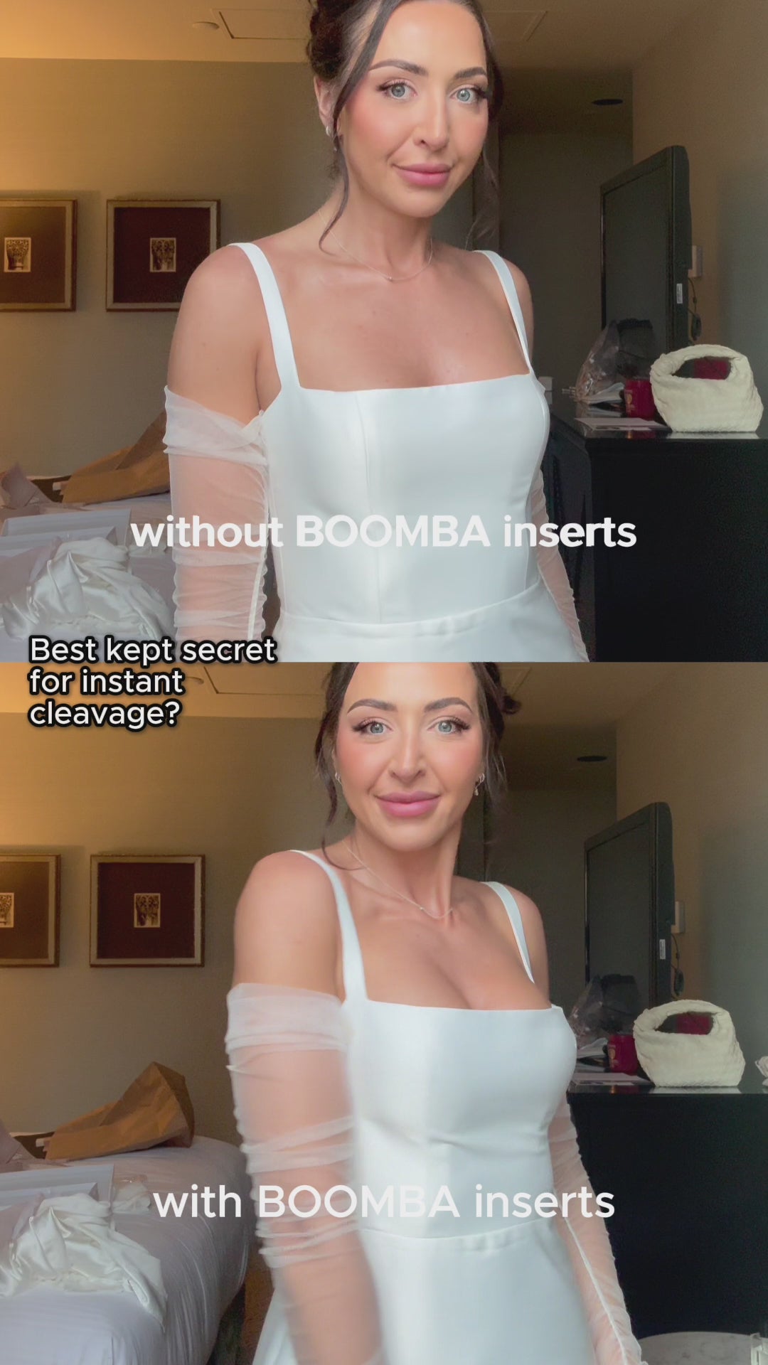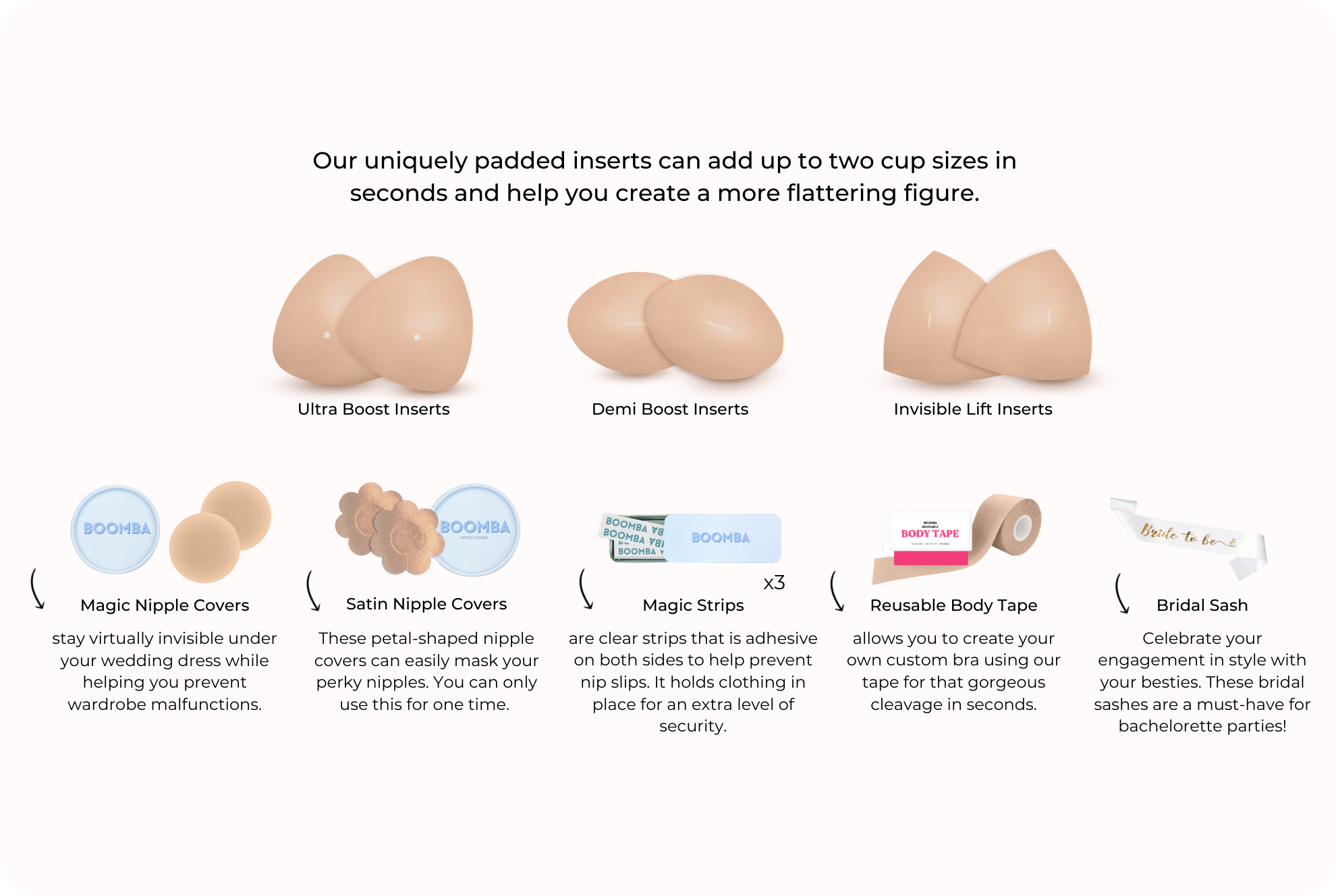Unlike a sticky bra that is supported by the adhesive, BOOMBA® inserts are supported by the clothing, they cannot stay up by themselves. It is crucial to wear them in tight, structured, and fitted tops.
