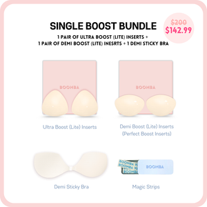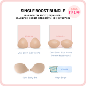 Looking for a natural-looking boost? Our Single Boost Bundle is made for you! Featuring the thinner versions of our best-selling Ultra Boost (Lite) and Demi Boost (Lite) Inserts. These Lite versions still deliver a noticeable lift and boost, just without the extra padding. Instantly add up to one cup size for a natural, everyday enhancement. Perfect for when you want a boost that’s low key but still high impact.