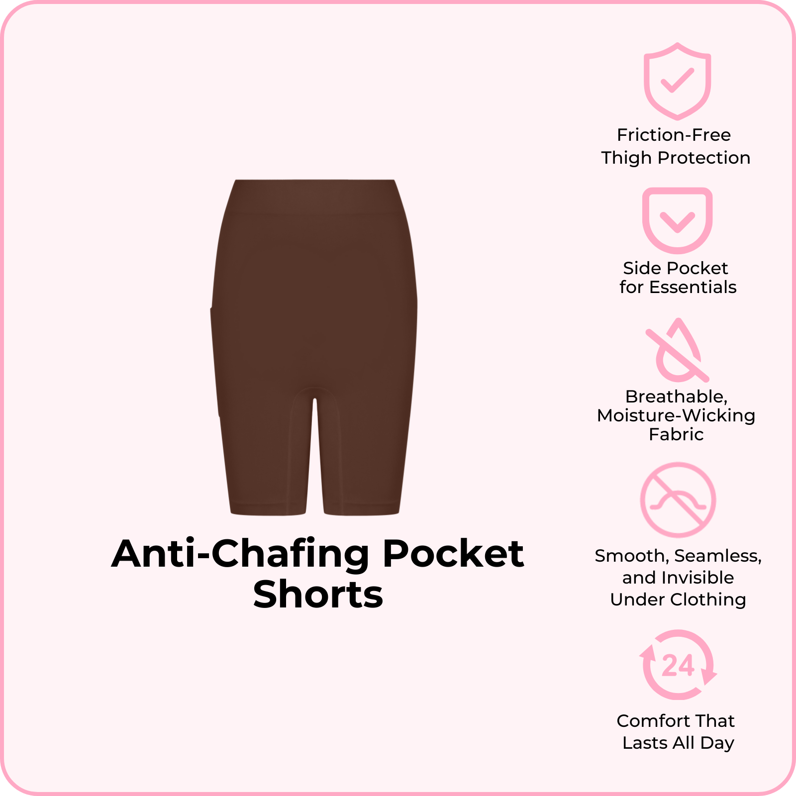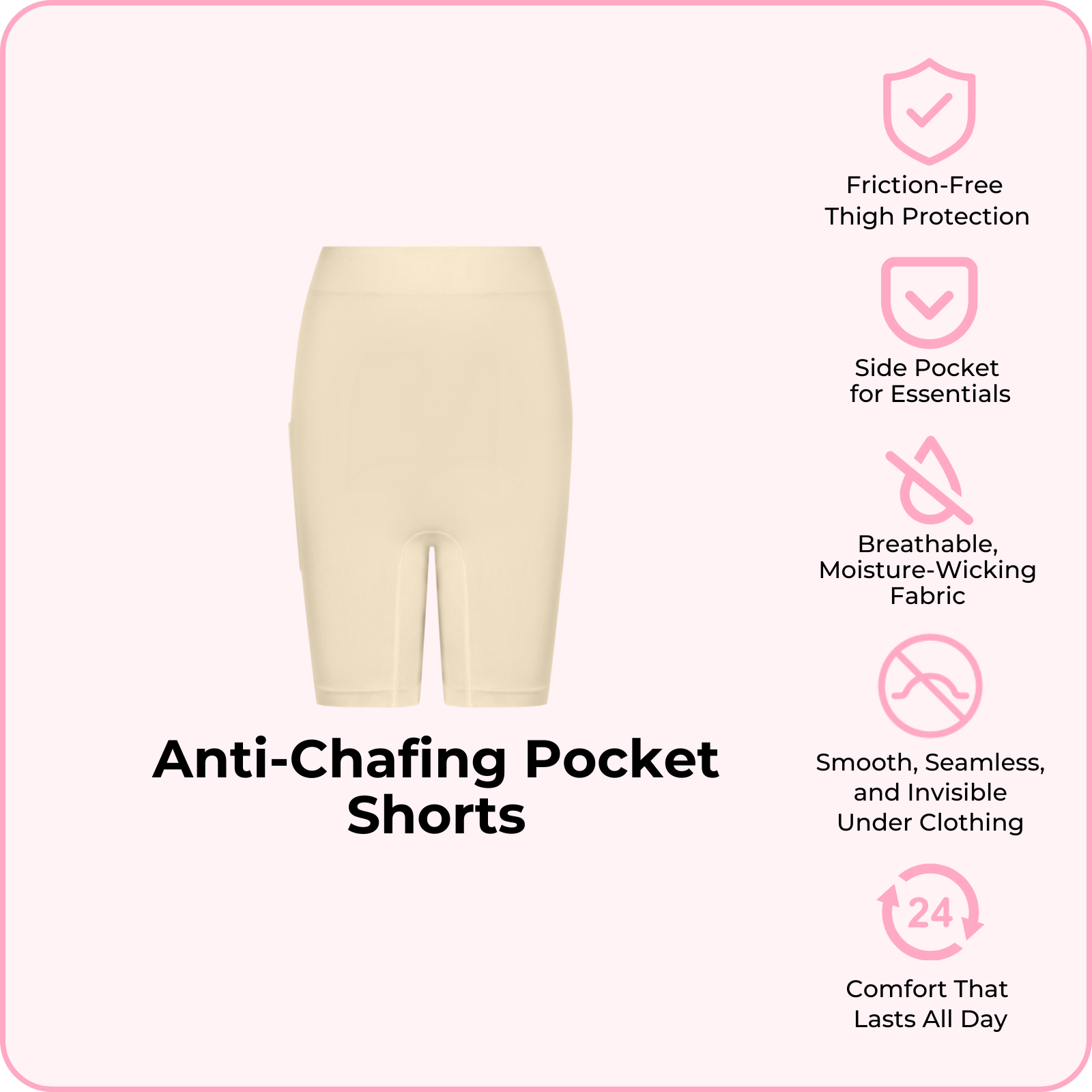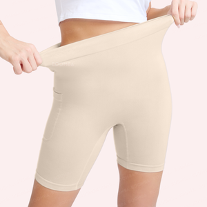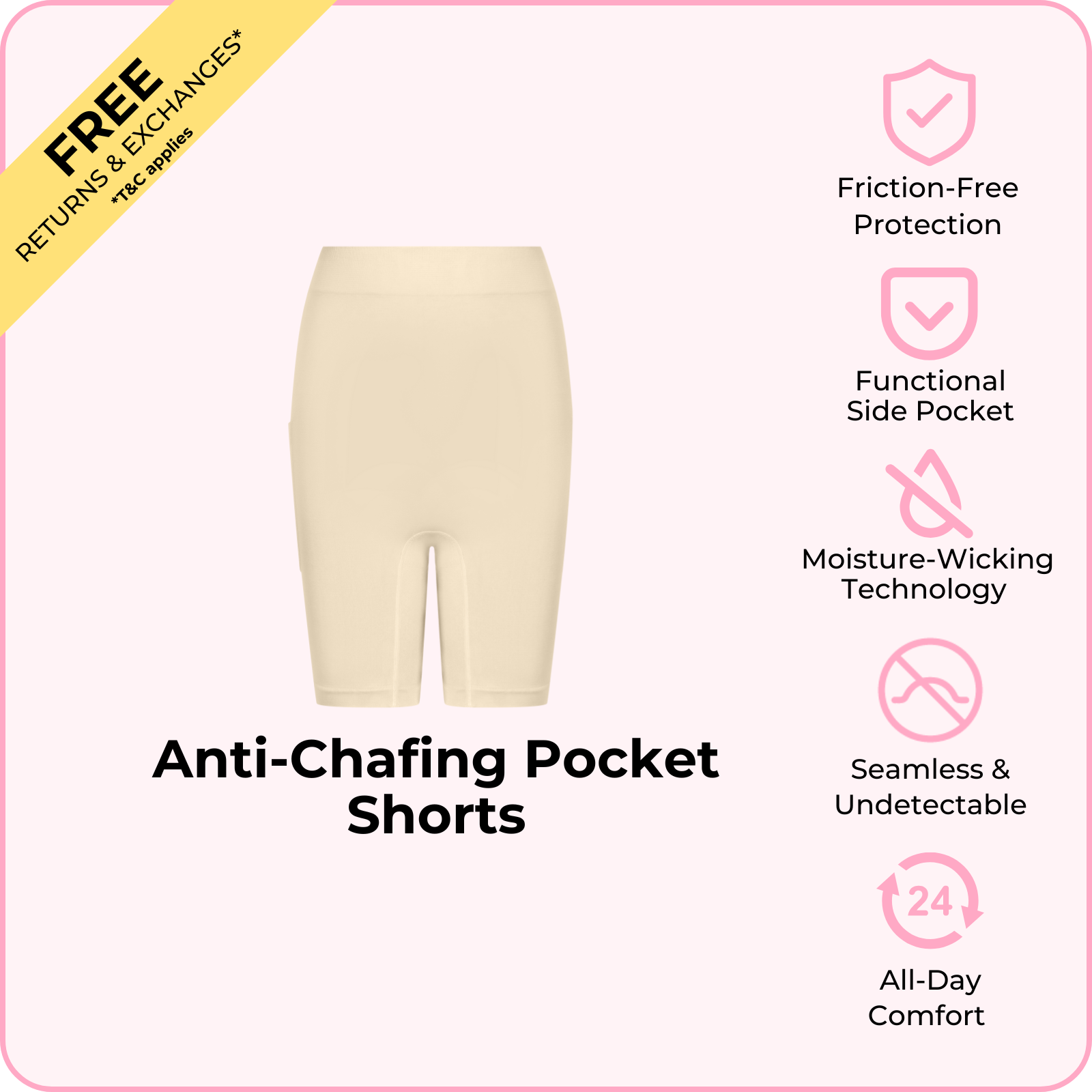 Crafted from an ultra-soft, breathable fabric, these shorts create a smooth, friction-free barrier between your thighs, so you can move confidently and comfortably throughout your day. The discreet pocket holds your phone, cards, or keys without adding bulk, giving you comfort and convenience in one effortless piece.