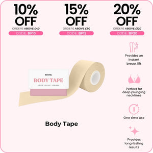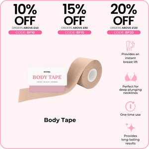 BOOMBA's Body Tape can be worn in various ways. Designed to contour with your shapes, our body tape is gentle yet strong, providing long-lasting results for up to 12 hours.