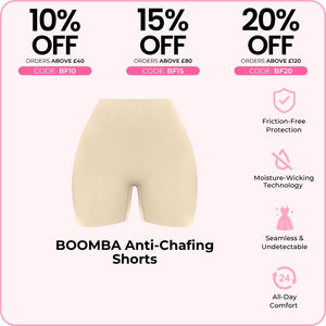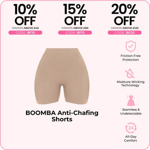 Thigh rub? Not today. BOOMBA’s Anti-Chafing Shorts are your go-to base layer for smooth, breathable comfort.