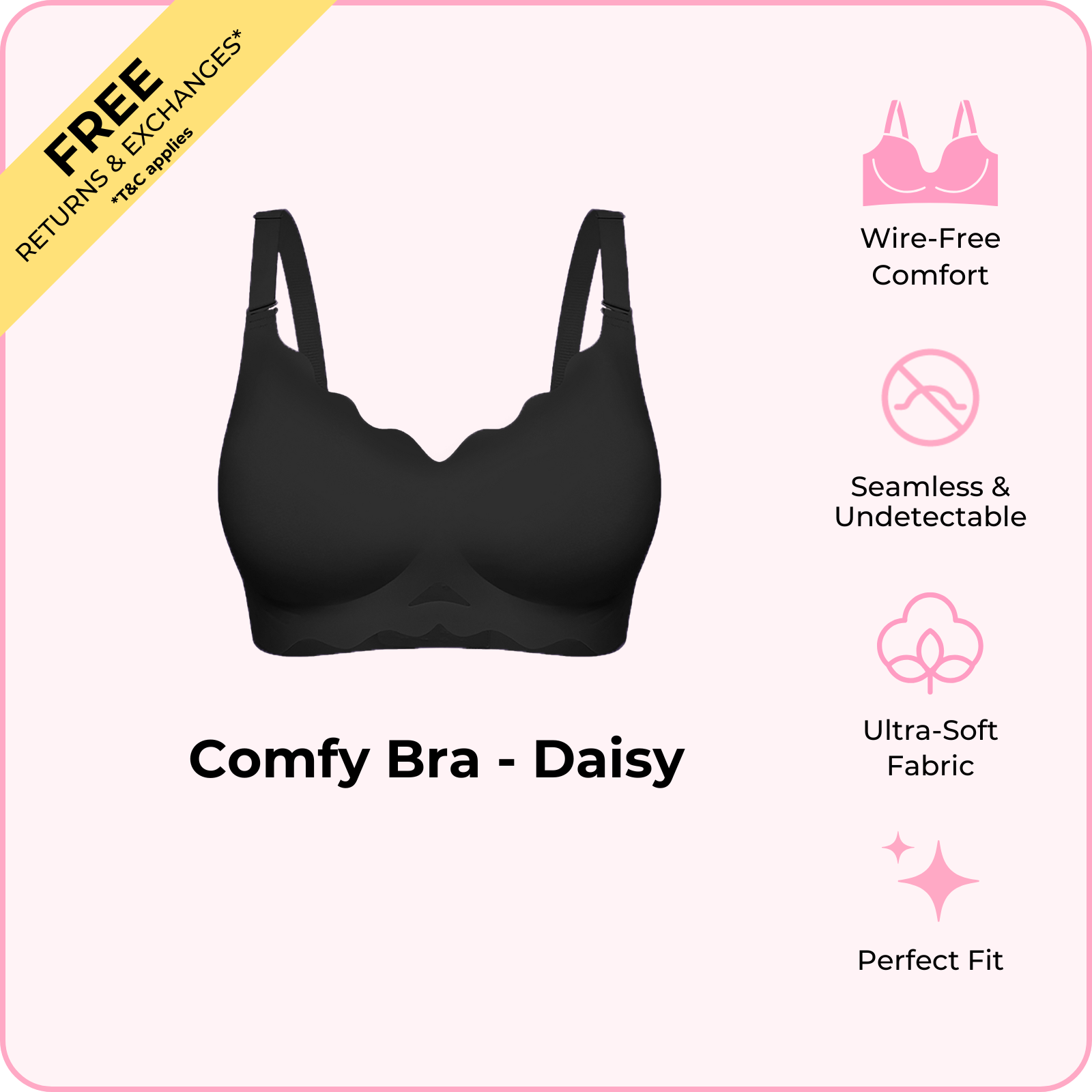Meet Daisy, the bra that feels good without trying. No wires digging in, no awkward adjusting, just soft fabric that feels like a second skin. The seamless cups disappear under whatever you wear, so you can go about your day without thinking twice.