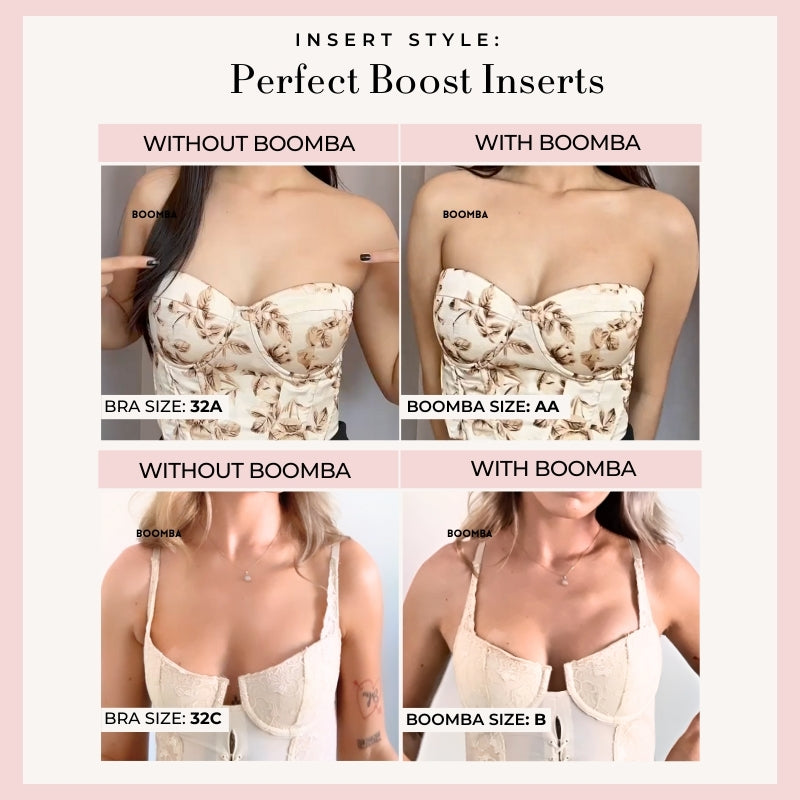 Check out BOOMBA’s Size Guide to find out which size is suitable for your body. Please note that results may vary depending on breast size and shape. Results will be similar to a double push up bra. BOOMBA results work best with natural breasts.