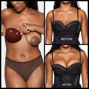 Preparation is key! Before using BOOMBA inserts, please ensure breasts are clean and dry. Any makeup, oil, lotion or other body products may hinder the inserts from sticking onto your skin properly. Put the clothing item on your body first, then place inserts onto the clothing item, then scoop breasts and stick onto the insert to secure.