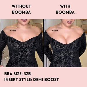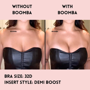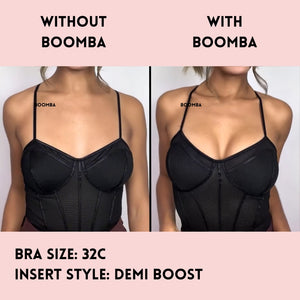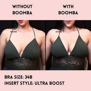 Please note that results may vary depending on breast size and shape. Results will be similar to a double push up bra. BOOMBA’s padded inserts work best with natural breasts.