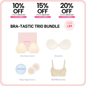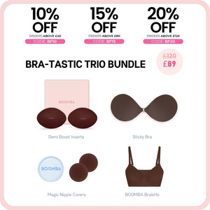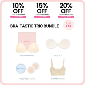 How to Remove: To remove your sticky bra, unclasp and gently peel off one cup at a time, starting from the top outer edge. Reapply protective films onto the sticky bra and store back into the BOOMBA gift box, away from direct sunlight.
