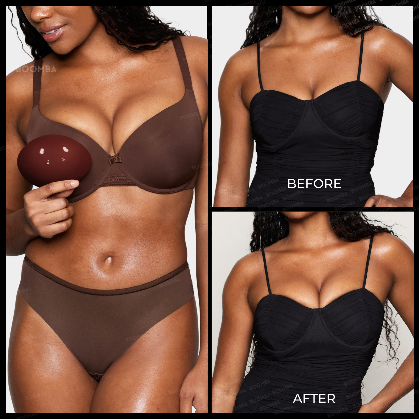 Check out BOOMBA’s Size Guide to find out which size is suitable for your body. Please note that results may vary depending on breast size and shape. Results will be similar to a double push up bra. BOOMBA results work best with natural breasts.