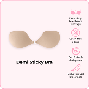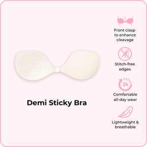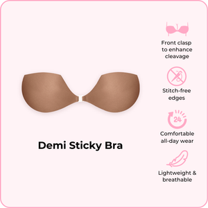 BOOMBA’s Demi Sticky Bra has a unique design. The bra cups in our Demi Sticky Bra are cut lower to ensure it always stays hidden under your top. The bra cups mold to fit your natural curves to provide natural-looking cleavage. Its stitch-free edging ensures it stays smooth under your clothing for a seamless look.