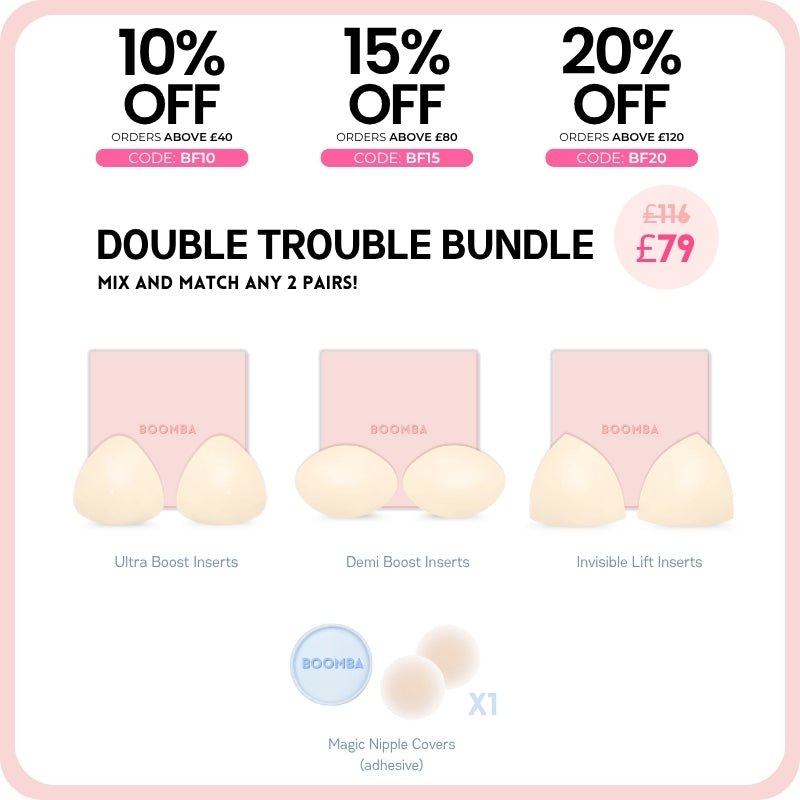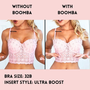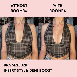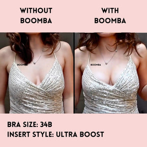 Please note that results may vary depending on breast size and shape. Results will be similar to a double push up bra. BOOMBA padded inserts work best with natural breasts.