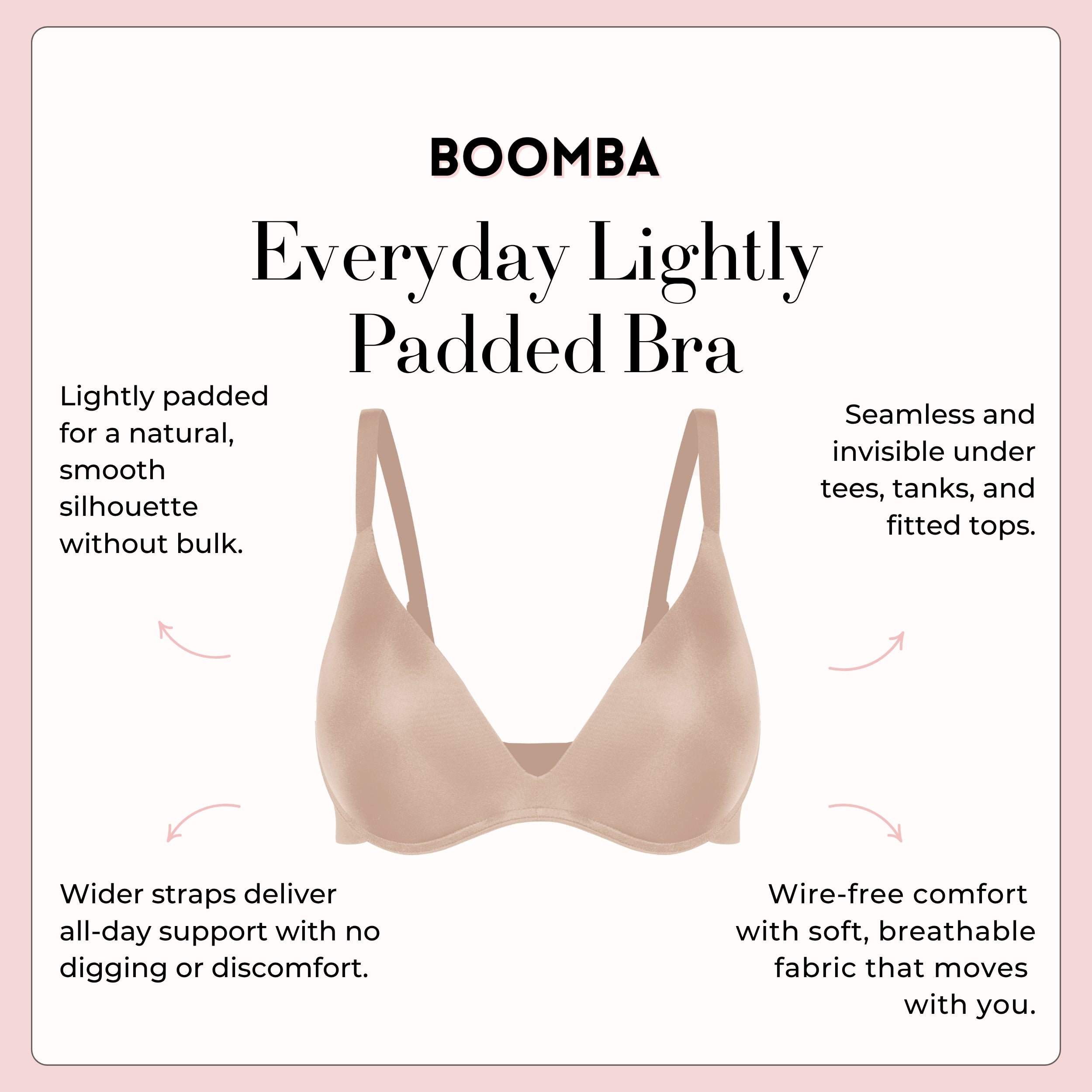 Meet your new daily go-to: The Everyday Bra by BOOMBA. Designed to feel like a second skin, this wireless, lightly padded bra with wider straps delivers the perfect balance of comfort, shape, and support. This is the bra you will want to wear every day, with everything