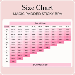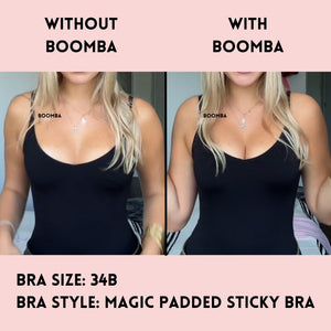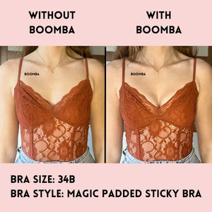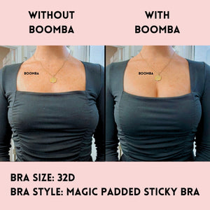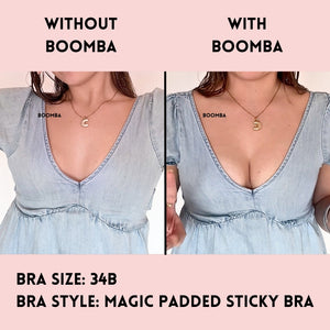 BOOMBA’s Magic Padded Sticky Bra is uniquely designed to add cup sizes discreetly. The natural padding in BOOMBA’s sticky bra eliminates the look of bulkiness that other padded sticky bras usually have. Ours is designed to curve with your breasts, creating a natural fuller look.