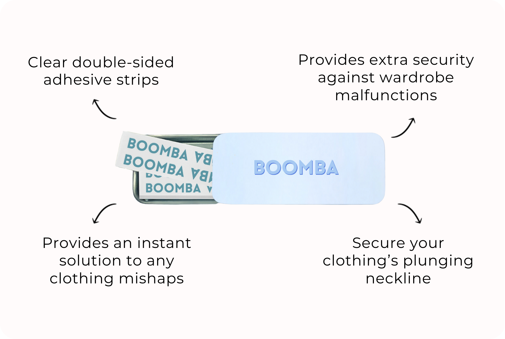 BOOMBA’s Magic Strips are clear adhesive strips that stick on both sides. They stick to your skin and to your clothing discreetly to provide an extra level of security against wardrobe malfunctions. Take the plunge with confidence, just peel, stick and go!