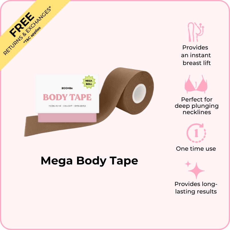 BOOMBA's Mega Body Tape can be worn in various ways. Designed to contour with your shapes, our body tape is gentle yet strong, providing long-lasting results for up to 12 hours.