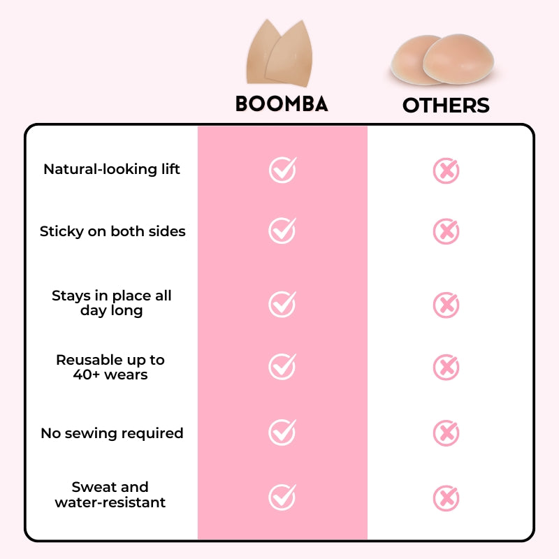Check out BOOMBA’s Size Guide to find out which size is suitable for your body. Please note that results may vary depending on breast size and shape. Results will be similar to a double push up bra. BOOMBA results work best with natural breasts.