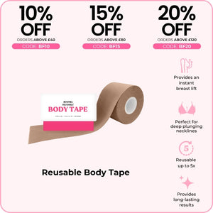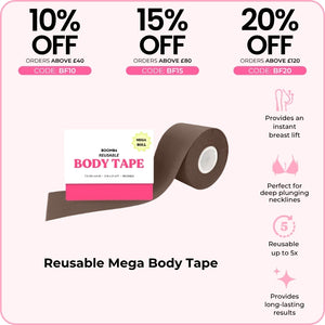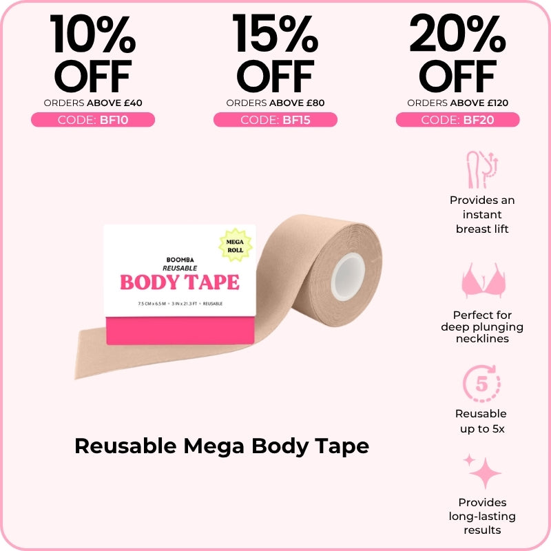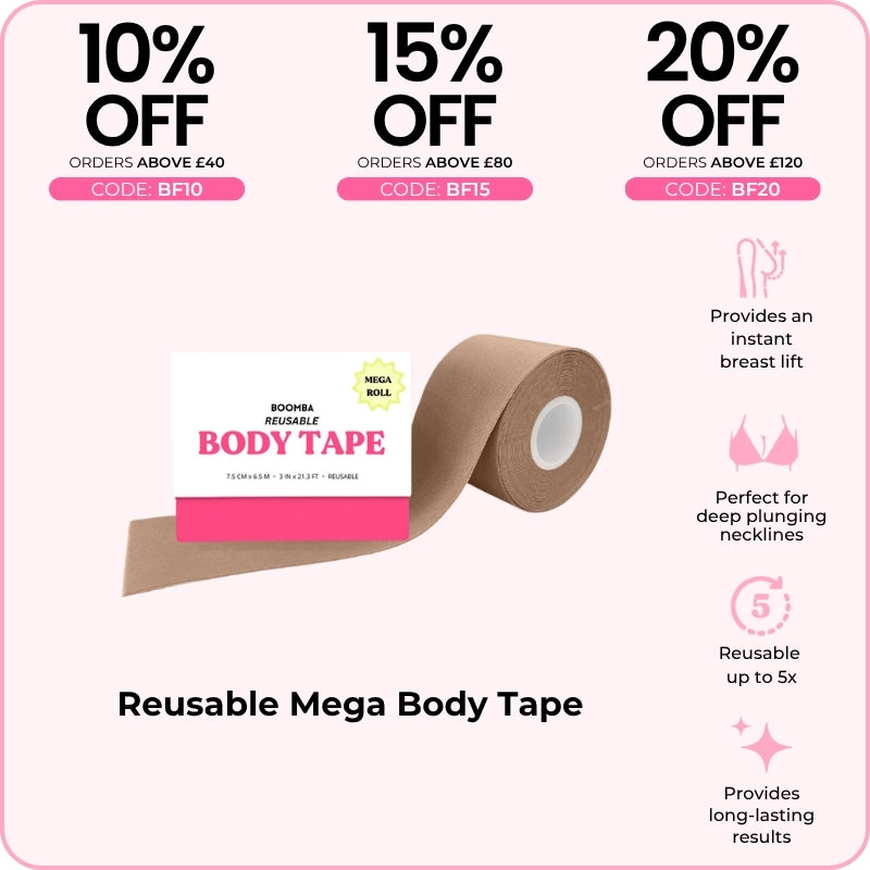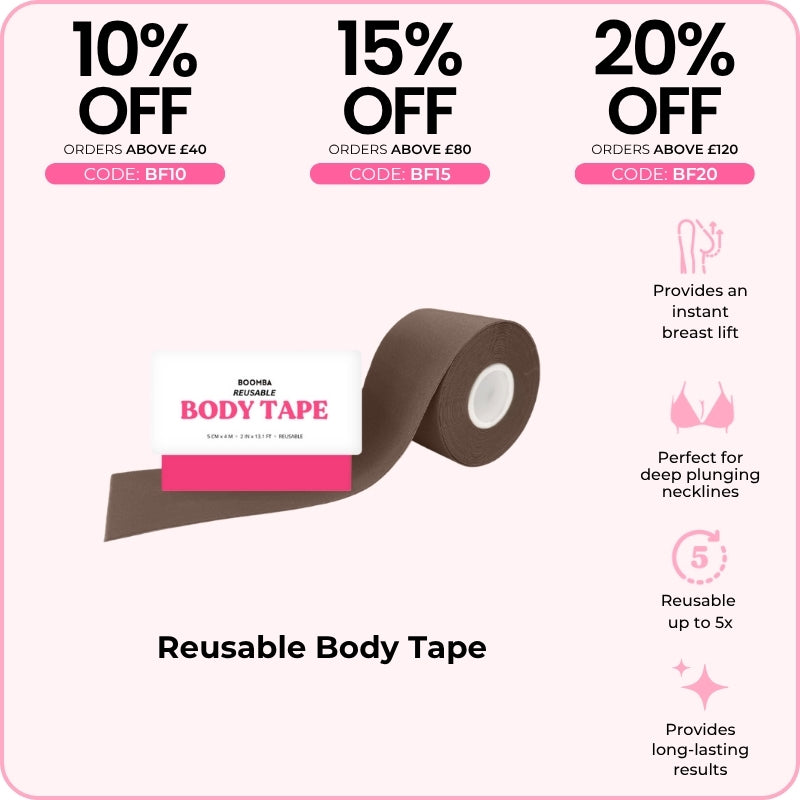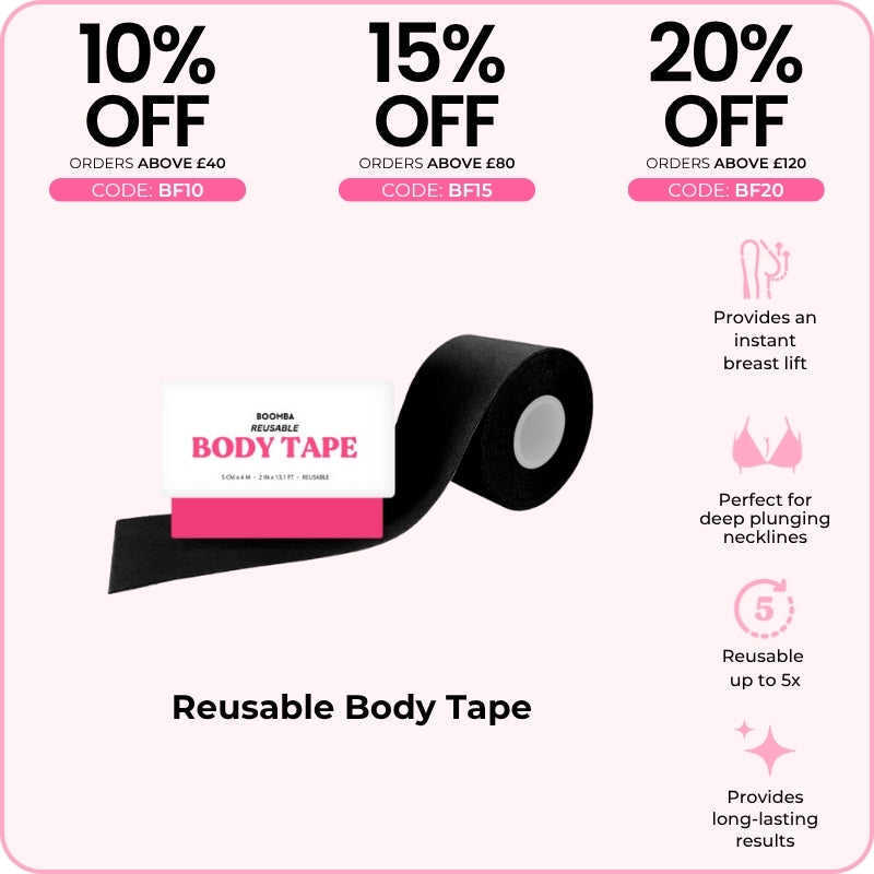 BOOMBA's Reusable Body Tape can be reusable up to five times. Designed to contour with your shapes, our body tape is gentle yet strong, providing long-lasting results for up to 12 hours.
