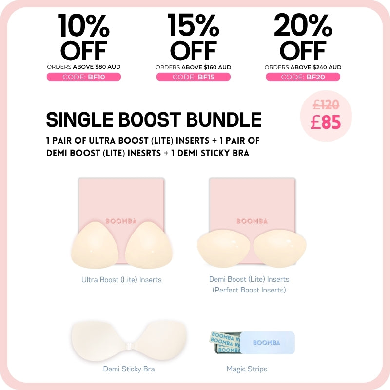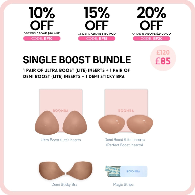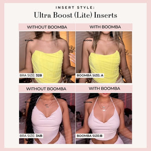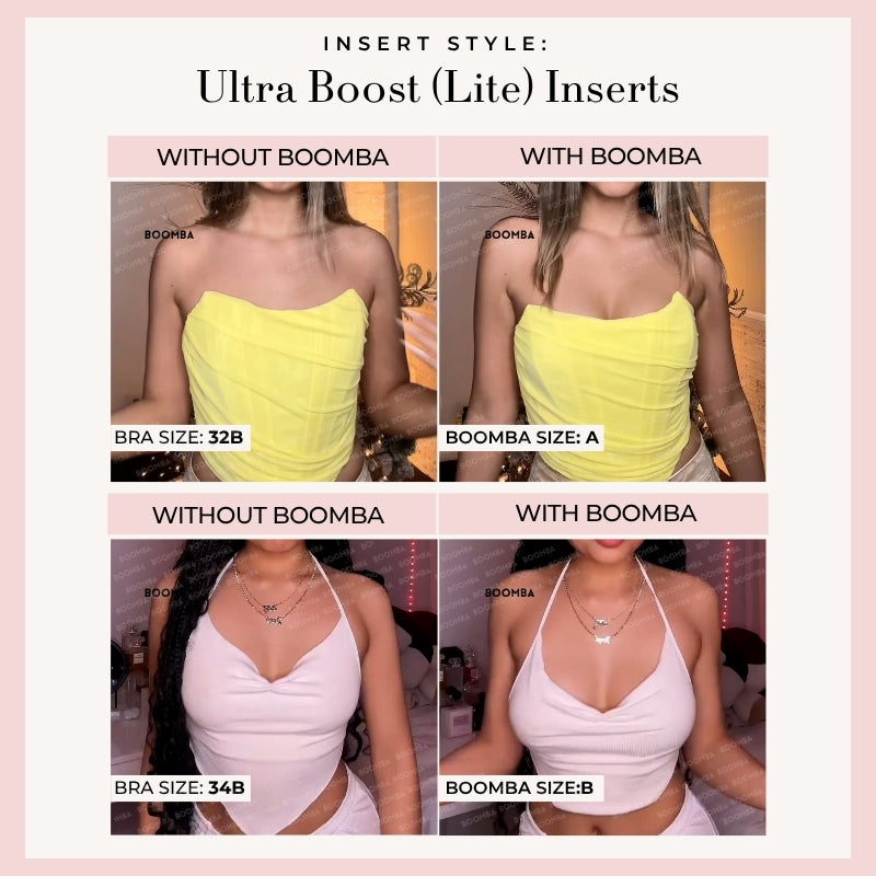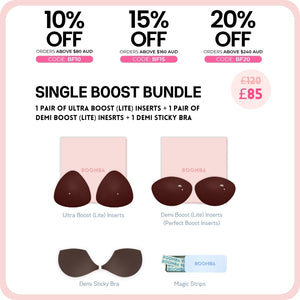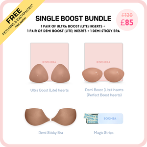 Looking for a natural-looking boost? Our Single Boost Bundle is made for you! Featuring the thinner versions of our best-selling Ultra Boost (Lite) and Demi Boost (Lite) Inserts. These Lite versions still deliver a noticeable lift and boost, just without the extra padding. Instantly add up to one cup size for a natural, everyday enhancement. Perfect for when you want a boost that’s low key but still high impact.