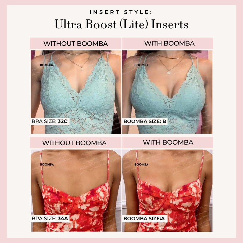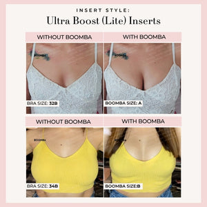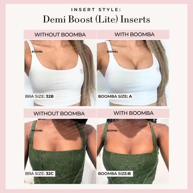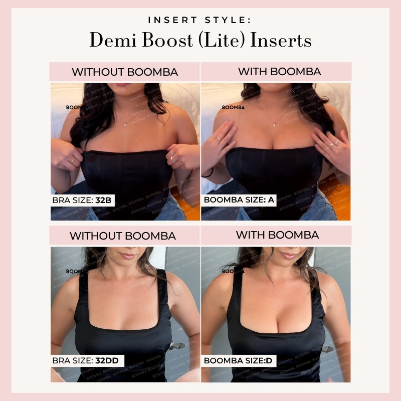 Please note that results may vary depending on breast size and shape. Results will be similar to a double push up bra. BOOMBA’s padded inserts work best with natural breasts.