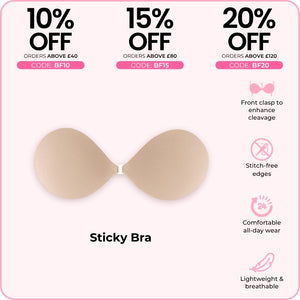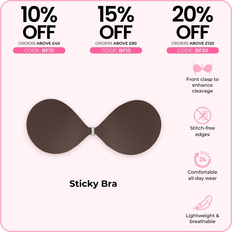 How to Remove: To remove your sticky bra, unclasp and gently peel off one cup at a time, starting from the top outer edge. Reapply protective films onto the sticky bra and store back into the BOOMBA gift box, away from direct sunlight.