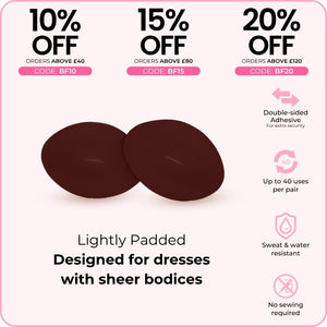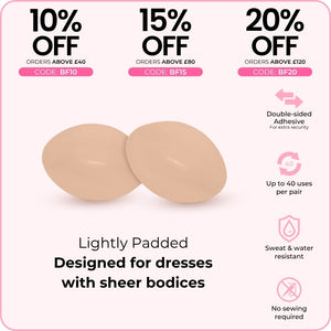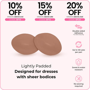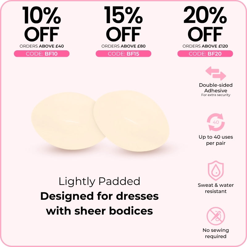 These lightly padded inserts are specifically designed to provide a subtle lift while also providing security against embarrassing wardrobe malfunctions. Perfect for wedding dresses with sheer bodices.