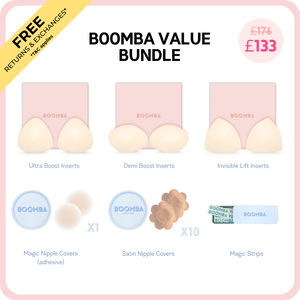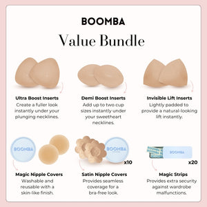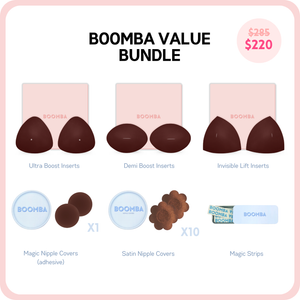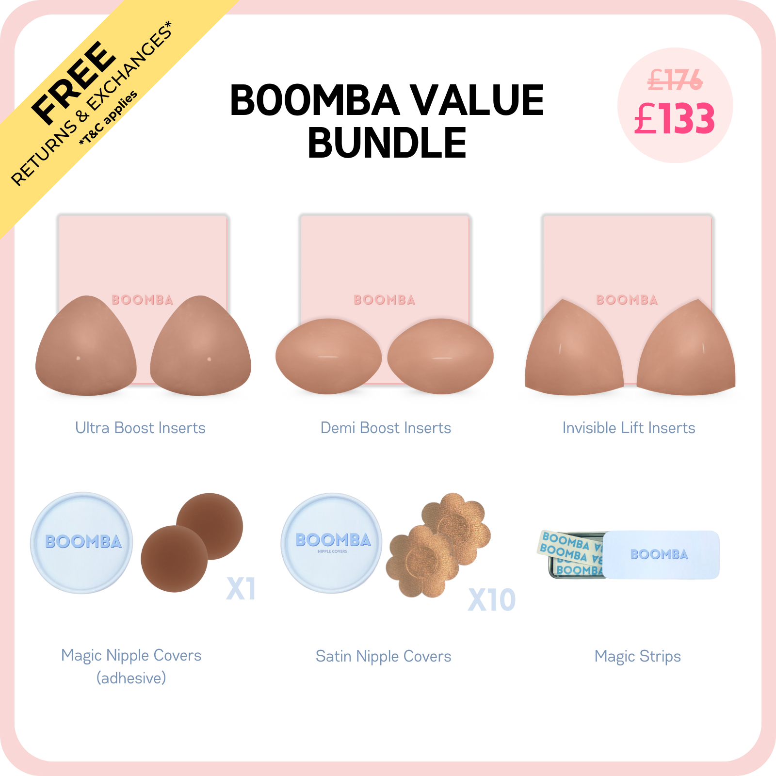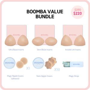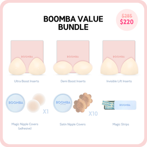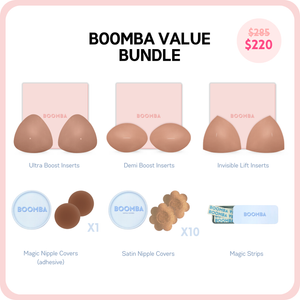 This bundle contains all three styles of our popular inserts, Ultra Boost, Demi Boost, and Invisible Lift. It also contains our best-selling Magic Nipple Covers (adhesive), Satin Nipple Covers, and BOOMBA Magic Strips