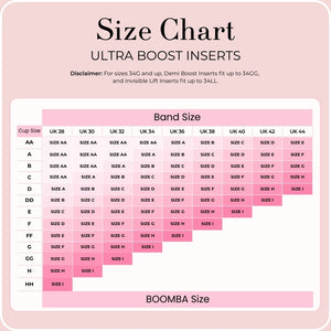 For sizes 34G and up, our Demi Boost Inserts (double push-up) are available in sizes up to 34J and our Invisible Lift Inserts (lightly padded) are available in sizes up to 34LL.