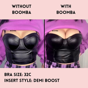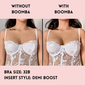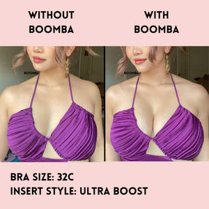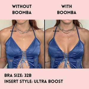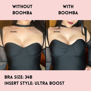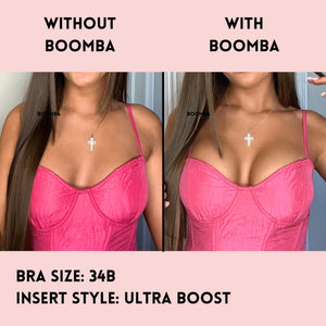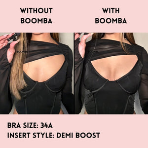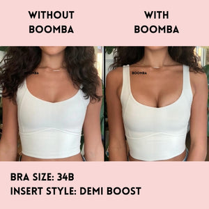 Please note that results may vary depending on breast size and shape. Results will be similar to a double push up bra. BOOMBA’s padded inserts work best with natural breasts.