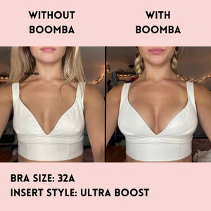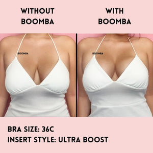 Please note that results may vary depending on breast size and shape. Results will be similar to a double push up bra. BOOMBA’s padded inserts work best with natural breasts.